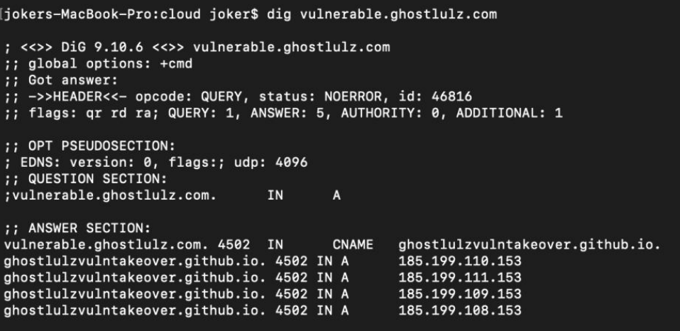 After we have an indicator that this site is vulnerable we need to get the GitHub page the vulnerable subdomain is pointing to. We need this information so we can register the domain through github.